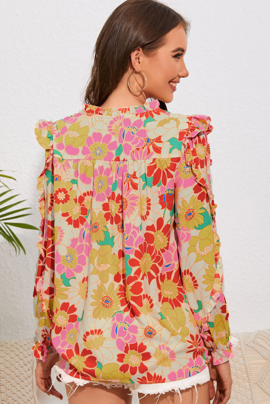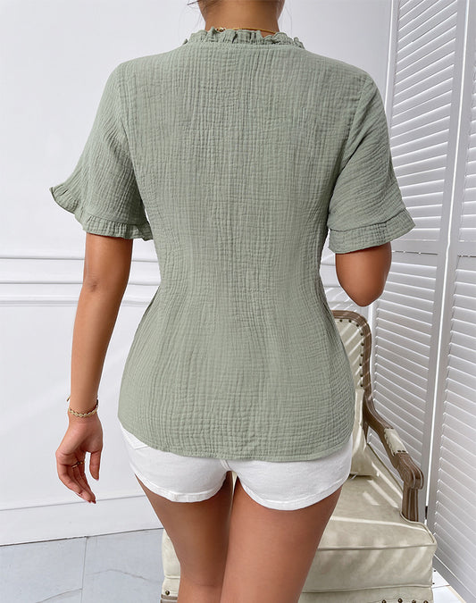 V-Neck Frill Trim Flounce Sleeve Shirt